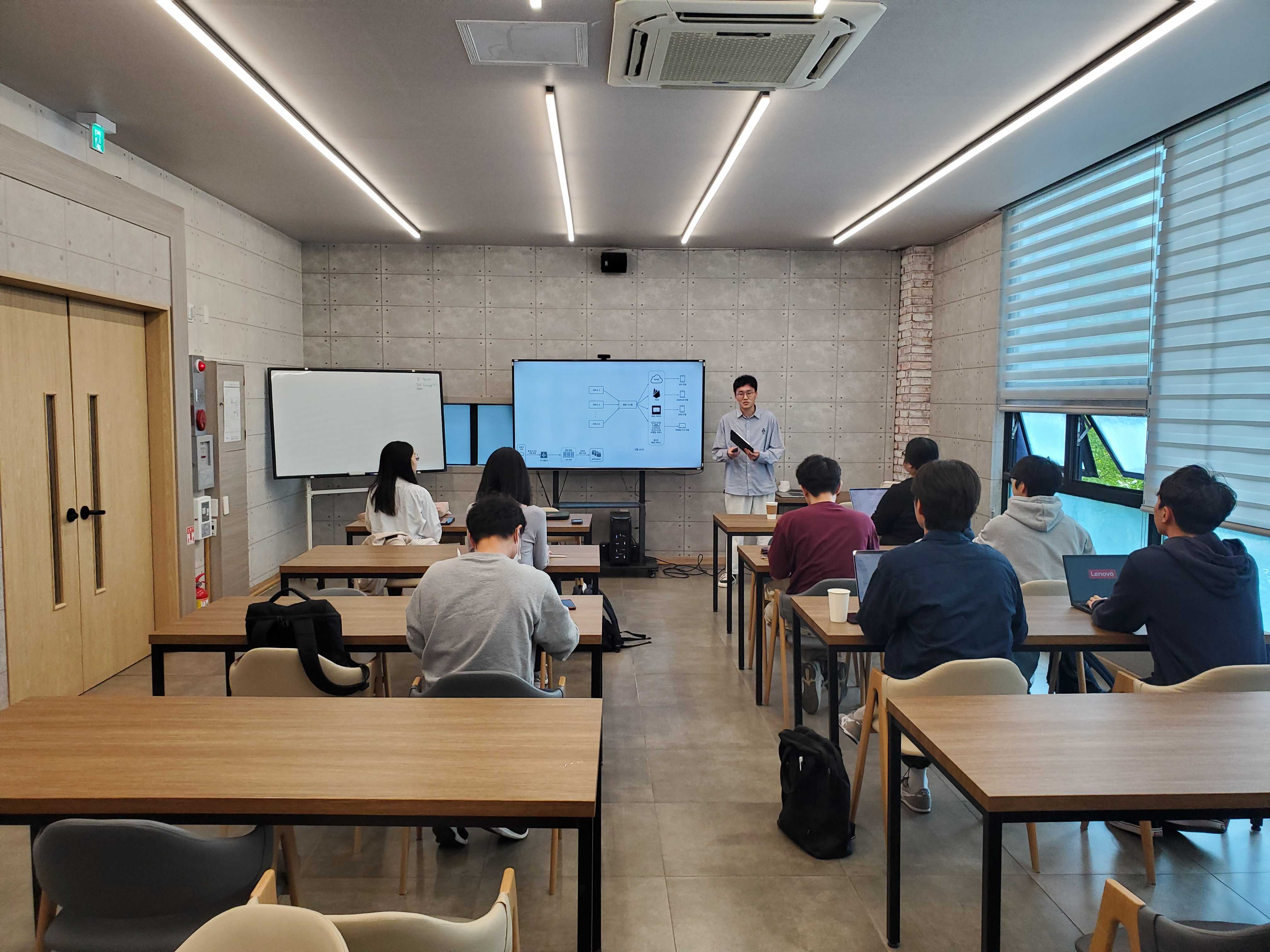 각자의 의견을 종합하여 화이트보드에 아키텍처를 그려서 설명을 해보도록 하였습니다. 시스템 디자인은 정답이 없는 만큼 어떤 컨셉으로 요구사항을 잘 적용하느냐가 중요하며, 그리고 해당 설계에 대해서 논리적으로 설명하는 것이 매우 중요하기에, 이러한 부분을 스스로 좋은 답을 찾을 수 있도록 토론 방식으로 진행 하였습니다.