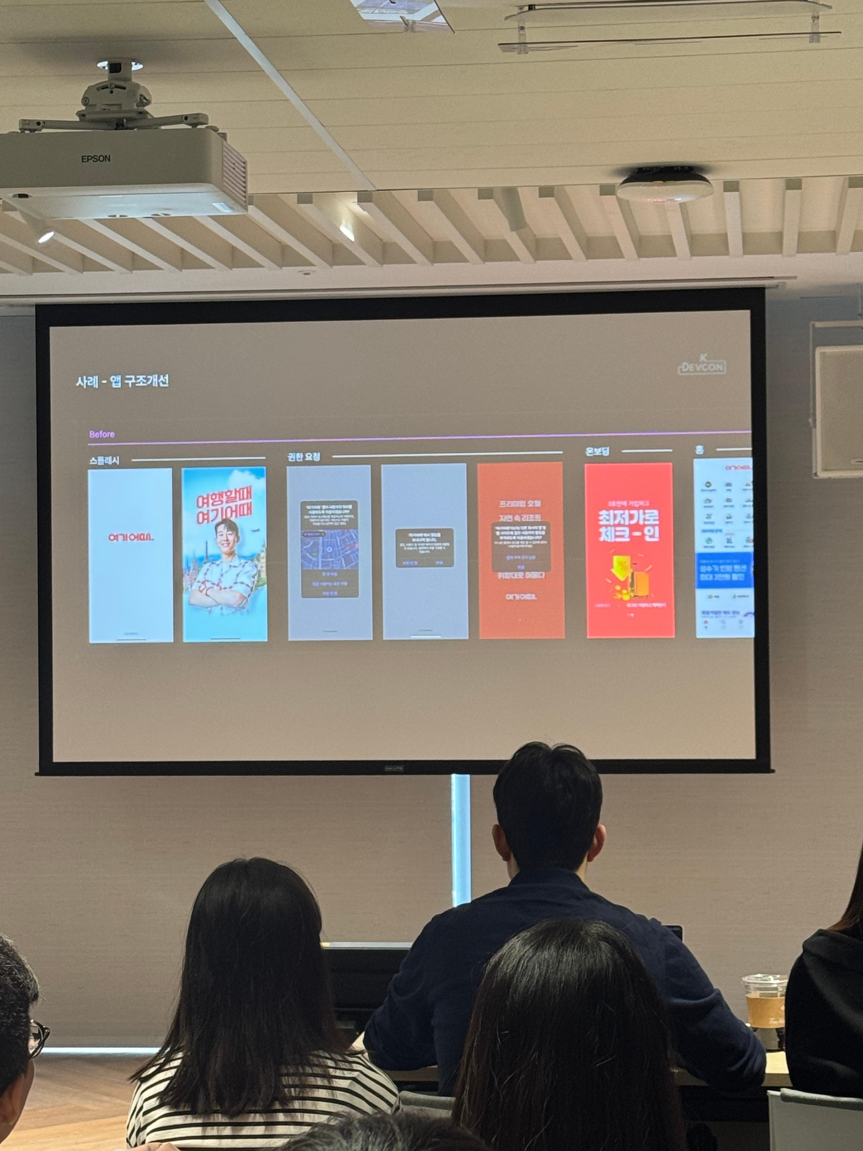 같은 세션대에 다른 룸에서는 김선일님 (여기어때 컴퍼니) 께서 성공적인 UX 솔루션을 위한 Key Things 라는 주제로 공감대가 탄탄한 UX 솔루션을 위한 방법을 소개해 주셨습니다. 무엇보다 실제 앱 구조 개선 사례를 통해 어떤 물리적 단계를 축소하고 유지보수 비용을 최소화했는지, 유저 입장에서 어떤 로그인 플로우를 유도해야 유연한 비즈니스 대응이 가능한지, 이 모든 작업을 가능하게하도록 팀은 어떤 프로세스에 집중하여 한 번에 완료할 수 있도록 할지고민의 흔적을 이야기해주셨습니다. 정말 유익했어요!