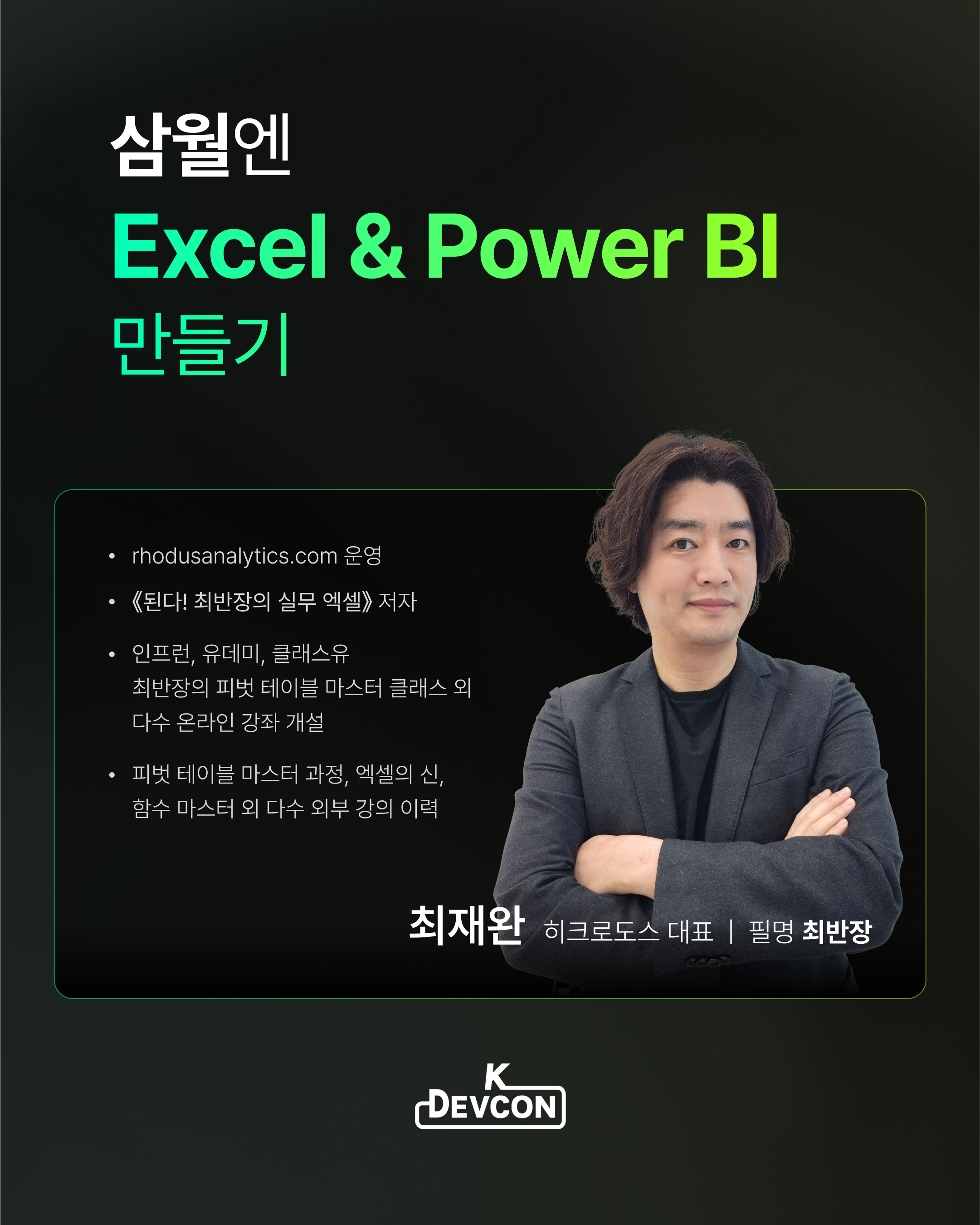 Excel, Power BI 그리고 생성형AI의 실무 활용 분야의 기업 교육, 콘텐츠 제작 및 BI 시스템 컨설팅 및 개발을 하고 있는 최재완이라고 합니다. '최반장'이라는 닉네임과 필명으로 활동하고 있고, BI 전문 교육, 콘텐츠 기업 '히크로도스(Hic Rhodus)'를 설립하여 운영중입니다. 《된다! 최반장의 실무 엑셀 with 피벗 테이블》의 저자이며, BI 전문 교육 서비스 《로도스 애널리틱스》를 운영 중입니다.