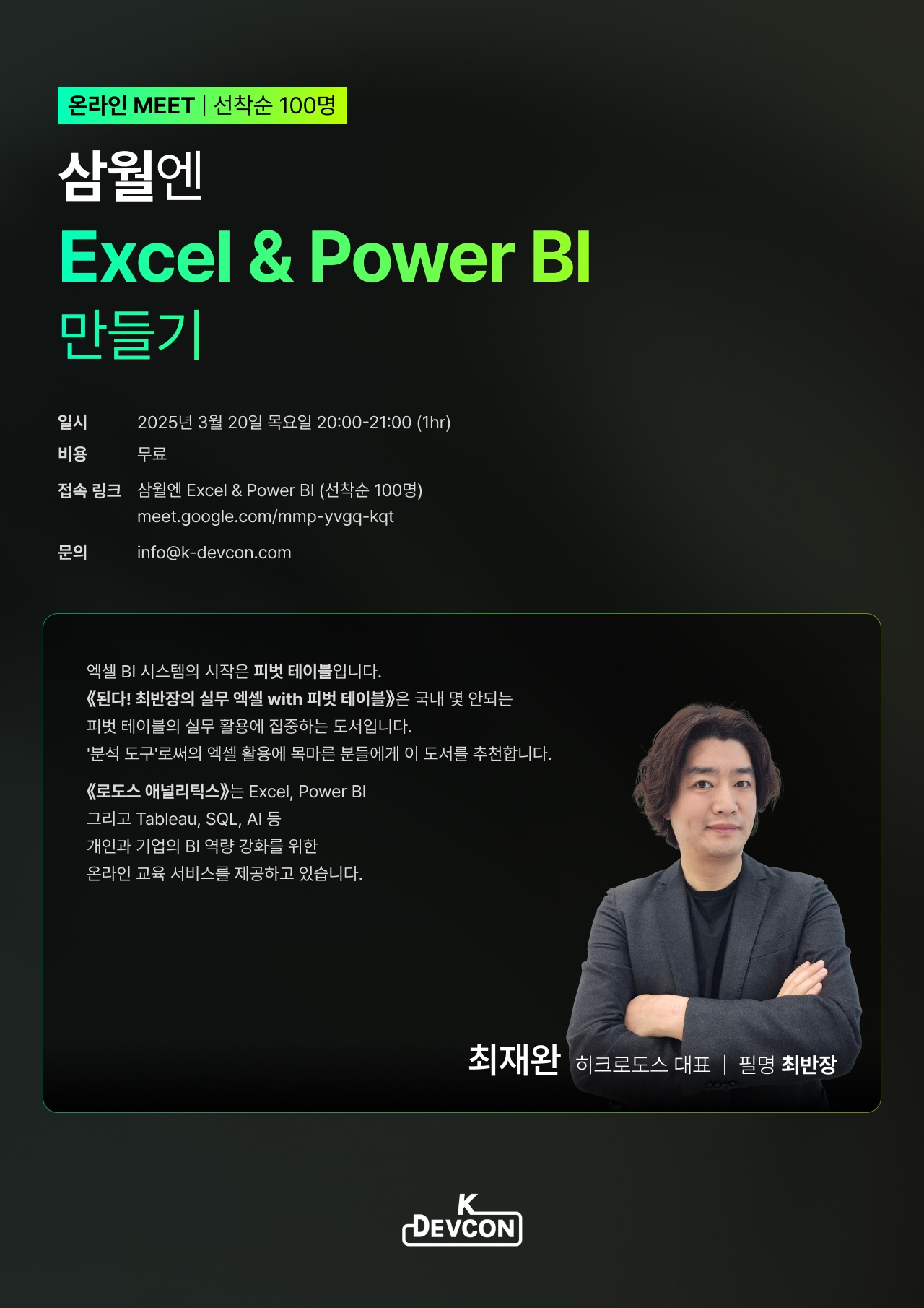 Excel, Power BI 그리고 생성형AI의 실무 활용 분야의 기업 교육, 콘텐츠 제작 및 BI 시스템 컨설팅 및 개발을 하고 있는 최재완이라고 합니다. '최반장'이라는 닉네임과 필명으로 활동하고 있고, BI 전문 교육, 콘텐츠 기업 '히크로도스(Hic Rhodus)'를 설립하여 운영중입니다. 《된다! 최반장의 실무 엑셀 with 피벗 테이블》의 저자이며, BI 전문 교육 서비스 《로도스 애널리틱스》를 운영 중입니다.