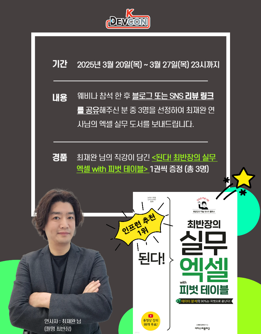 3명을 선정하여 최재완 연사자 직강! 실무 엑셀 도서를 드립니다! 🫶