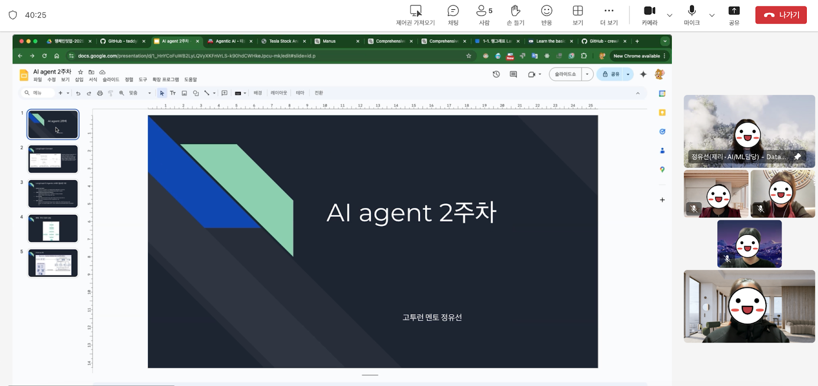 다음 주에는 각자 생각하는 Agent 설계 아이디어를 가져와 공유하고 토론할 예정이라고 하니, 앞으로의 전개도 매우 기대됩니다!