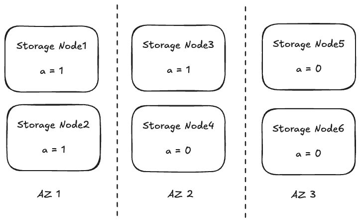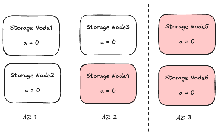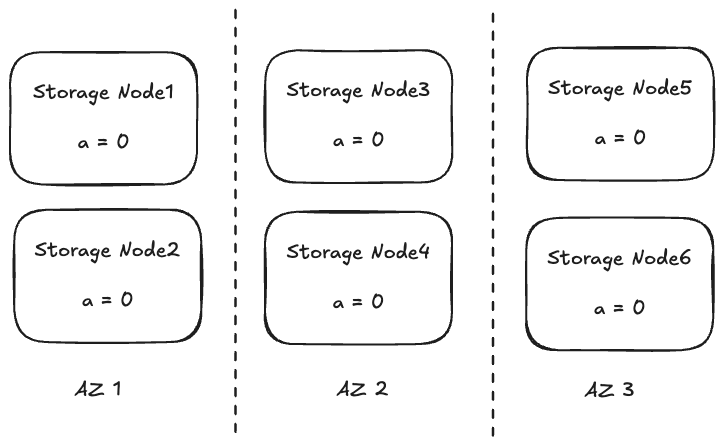 진짜일까요? 먼저, W=3, R=3 인 상황을 생각해보겠습니다. 모든 Node 가 ‘a=0’ 이라는 값을 가지고 있다고 가정해보겠습니다.