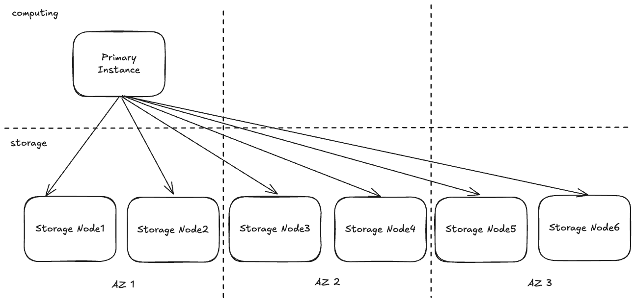Aurora는 기존의 DataBase 에서 컴퓨팅 영역과 스토리지 영역을 나누어 관리합니다. 스토리지 영역은 3개의 AZ 와 각 AZ 마다 2개의 스토리지 노드로 구성하여 총 6개의 노드로 구성되어있습니다.