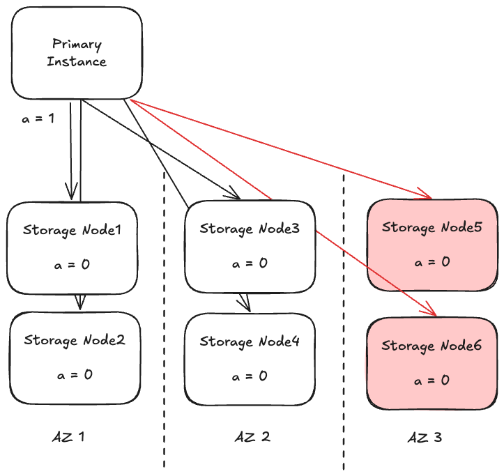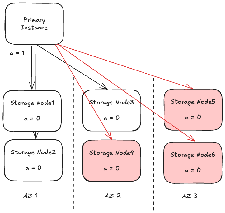 이때 a 의 값을 요청하면 어떻게 될까요? R=3 이기 때문에, 6개의 노드 중 어떤 3개로 부터 값을 수신하더라도 정상인 데이터(a=1)를 수신하거나 데이터 충돌을 판단할 수 있는 데이터(a=1, a=0)를 얻을 수 있게 됩니다. 따라서 W=4, R=3 인 경우 강한 일관성을 만족하게 됩니다. Amazon Aurora는 강한 일관성 (W + R > N) 을 가지고 있음을 볼 수 있습니다.