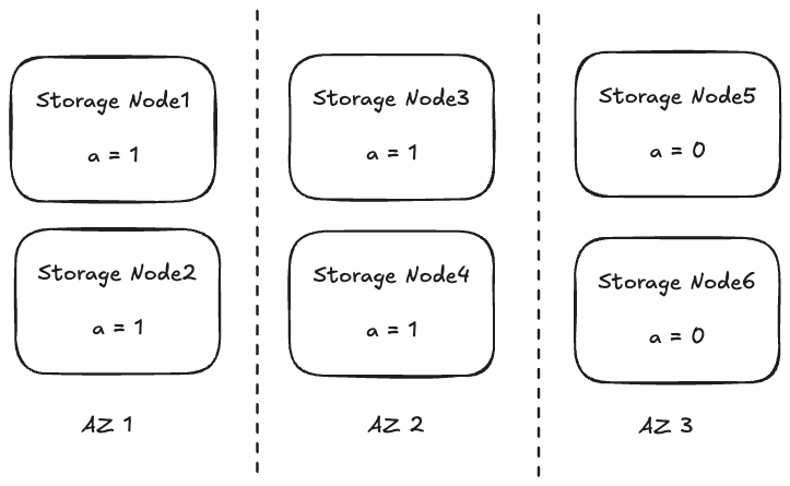 W=3 이기 때문에, 살아있는 3개의 노드가 응답을 해준다면 Node 1, 2, 3 은 a=1 로 업데이트가 될 수 있을 것입니다. Node 4, 5, 6 은 다운되어 있기 때문에 요청을 받지 못하고 a=0 상태로 남아있습니다. 이후에 Node 4, 5, 6 이 다시 살아나게 되면 아래와 같은 상황이 될 것입니다.