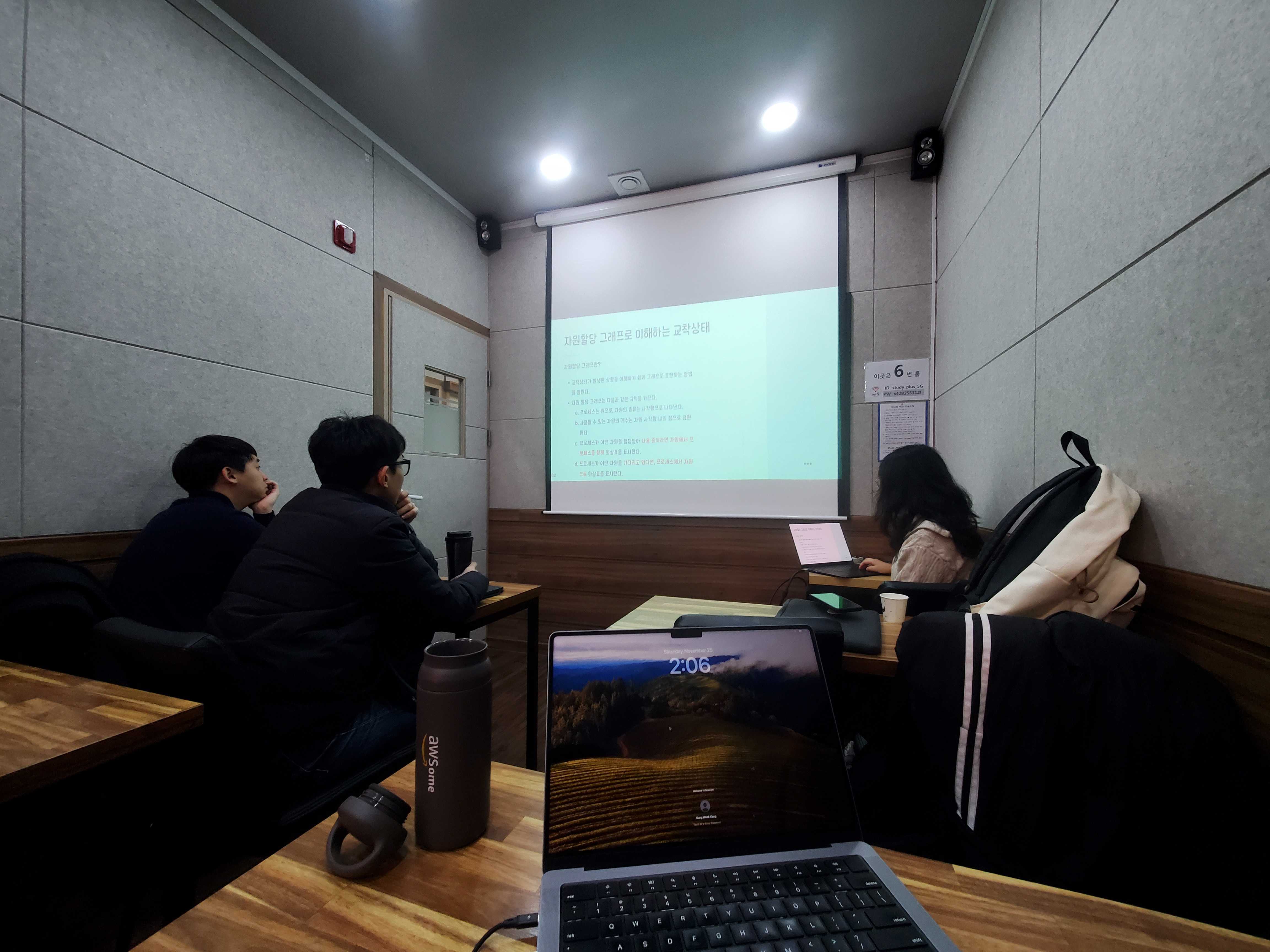 오늘 스터디는 충남대 근처의 공간에 모여서 진행하였습니다. 스터디 위치는 상황에 따라 변경되므로, 반드시 스터디에 참석하고 싶으신 분은 멤버십 가입 후 슬랙에서 공지사항을 확인해주시기 바랍니다.