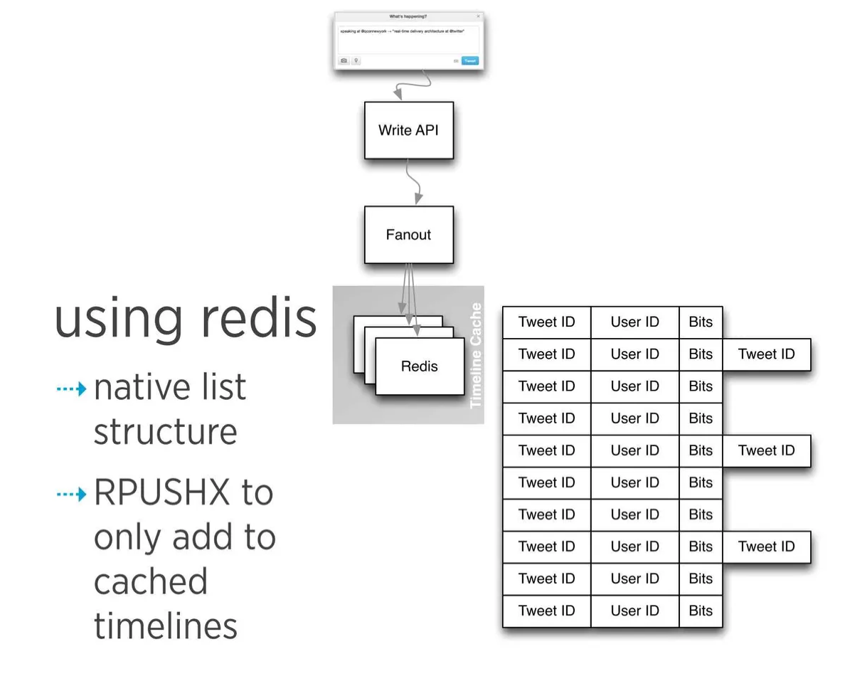 뉴스피드 시스템 설계에서는 빠른 응답을 위해 Cache를 적극적으로 사용하는 것이 특징입니다. 실제로 트위터의 경우 Redis를 적극적으로 사용한 것을 발표자료를 통해 엿볼 수 있습니다. (Timelines at Scale)