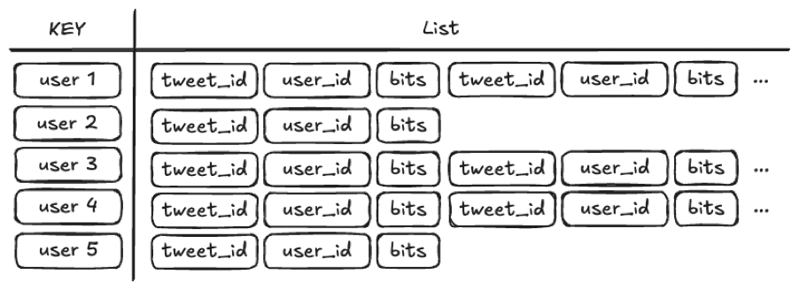 여기서 각 row는 사용자의 타임라인을 의미하게 됩니다. 그리고 그 뒤로 트윗 정보가 추가되게 됩니다.