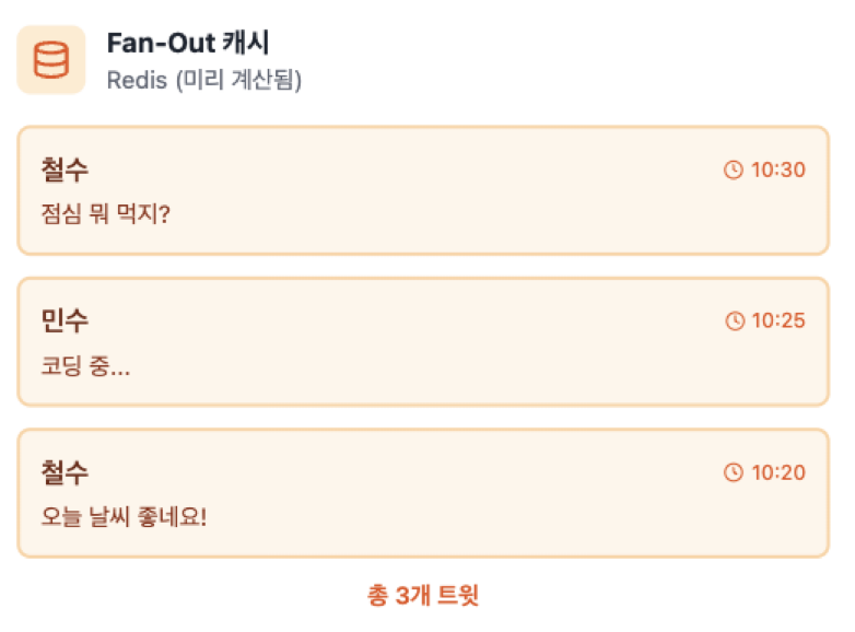 쓰기 시점에 팬아웃 방식에서는 전달된 데이터를 뉴스 피드로 미리 생성해둡니다. 이를 통해 읽기 시 미리 계산된 타임라인을 통해 빠르게 데이터를 반환해줄 수 있습니다.