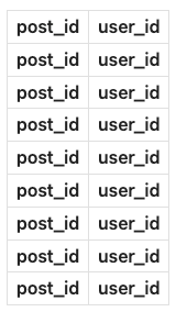 책에서는 아래와 같은 <포스팅 id, 사용자 id> 의 순서쌍을 보관하는 매핑 테이블에 데이터를 넣는다고 되어있습니다.
