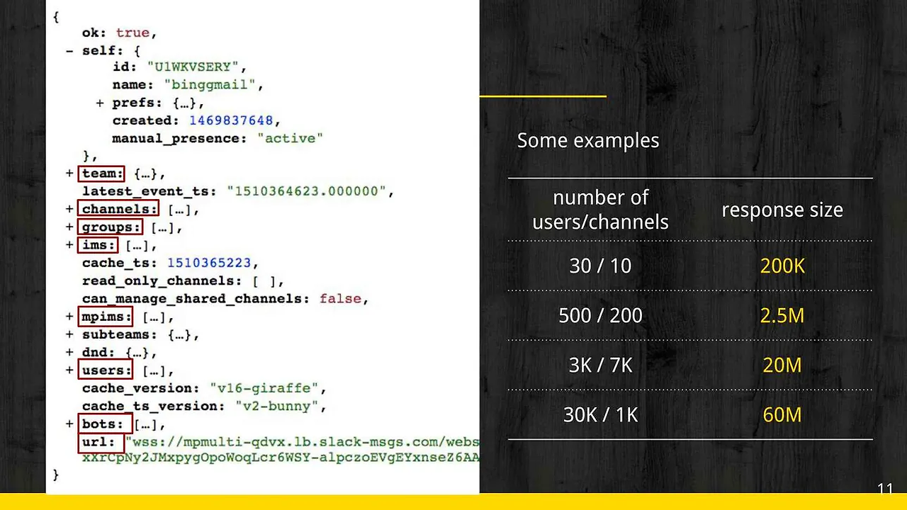이러한 문제를 개선하고자 슬랙은 초기에 받는 데이터를 필수 데이터만 가져오도록 변경합니다.(필수 데이터에는 Websocket 과 통신할 수 있는 URL 을 포함합니다.) 그리고 그 이후에 API를 통해서 필요한 데이터를 받아오는 형태로 변경합니다.