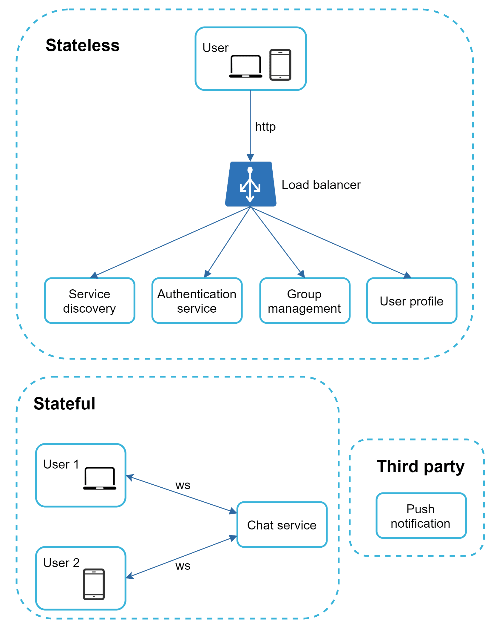 채팅 시스템의 기본적인 설계는 다음과 같습니다. 상태 서비스(stateful service)와 무상태 서비스(stateless service)로 나눠지게 됩니다. 상태 서비스는 채팅 서버에서 지속적으로 통신을 이어나가기 위해 사용됩니다.
