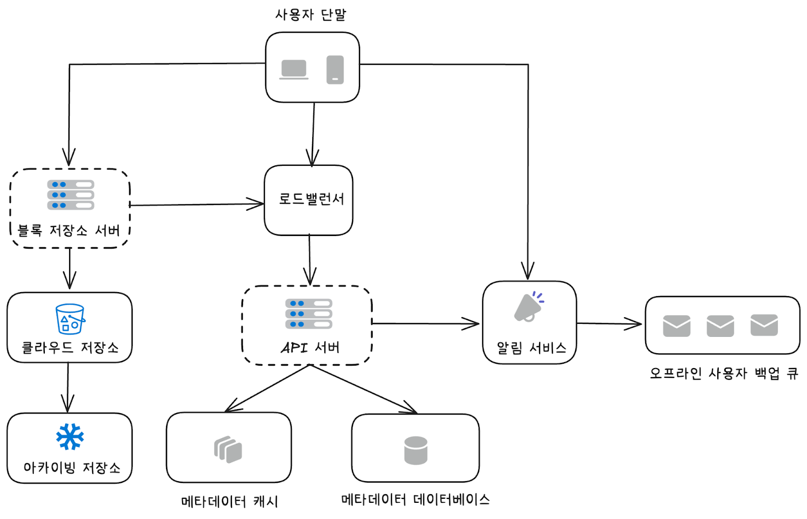 블록 저장소 서버는 파일 업로드 및 관리를 담당하는 서버입니다. 이때 클라이언트가 보낸 파일은 블록단위로 나누어야 하고 (혹은 애초에 업로드할 때부터 나눠서 올리고) 각 블록에 압축 알고리즘을 적용하고 암호화 처리까지 담당합니다.