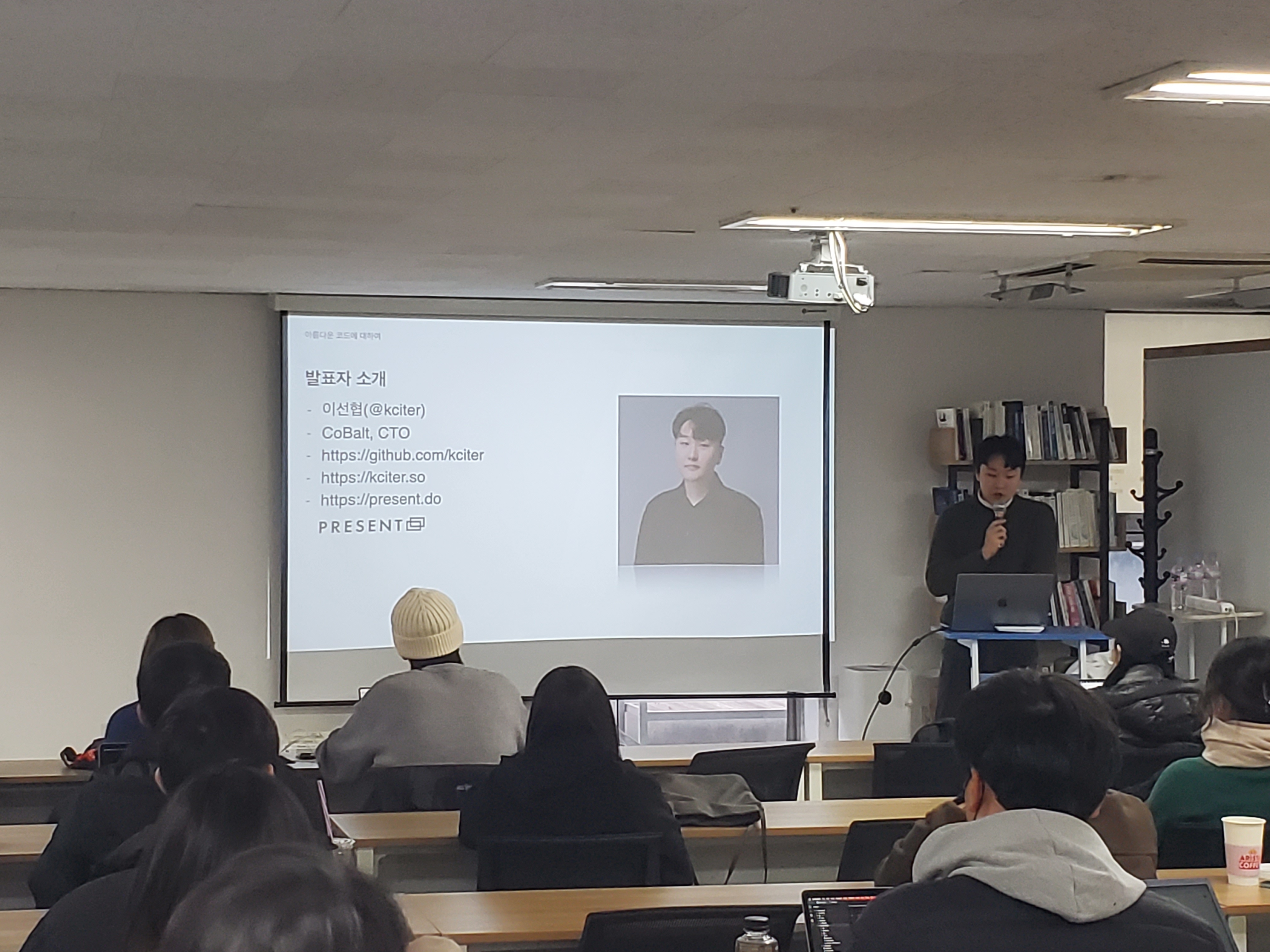 마지막 발표는 코발트에서 CTO로 활동중인 이선협님께서 “아름다운 코드에 대하여”라는 주제로 진행해주셨습니다.