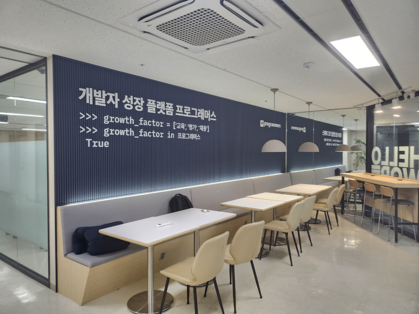 2024년 데브콘 서울 챕터 “일월엔 신장개업” 밋업이 성황리에 진행된 프로그래머스의 입구 모습입니다! 입구에 들어서자마자 로비가 마련되어 있어서 자리에 착석해서 대기하실 수 있고, 간단한 업무도 가능해보였습니다. 꼭 밋업만이 아니라 강남역을 지나다가 잠시라도 들러서 커피챗을 하고 싶은 마음이 샘솟더라고요! 🧑💻