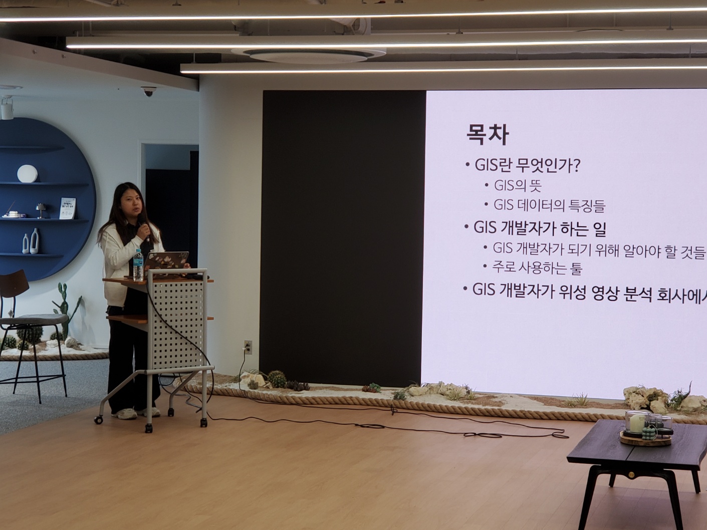 첫번째 세션은 "GIS 개발자는 무슨 일을 할까?" 라는 주제로, 위성 데이터 분석 회사인 SIA에서 GIS 엔지니어로 재직중이신 정혜미님께서 진행해 주셨습니다. 😊