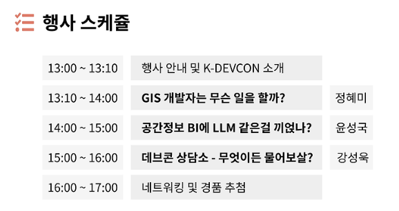 첫번째 세션에서는 사람들에게 조금은 생소할 수 있는 GIS 개발자가 어떤 일을 하는지 알아보았고, 두번째 세션에서 공간정보 데이터와 LLM을 활용하여 편리하게 지리정보 데이터를 분석하는 방법에 대해 알아보았습니다.