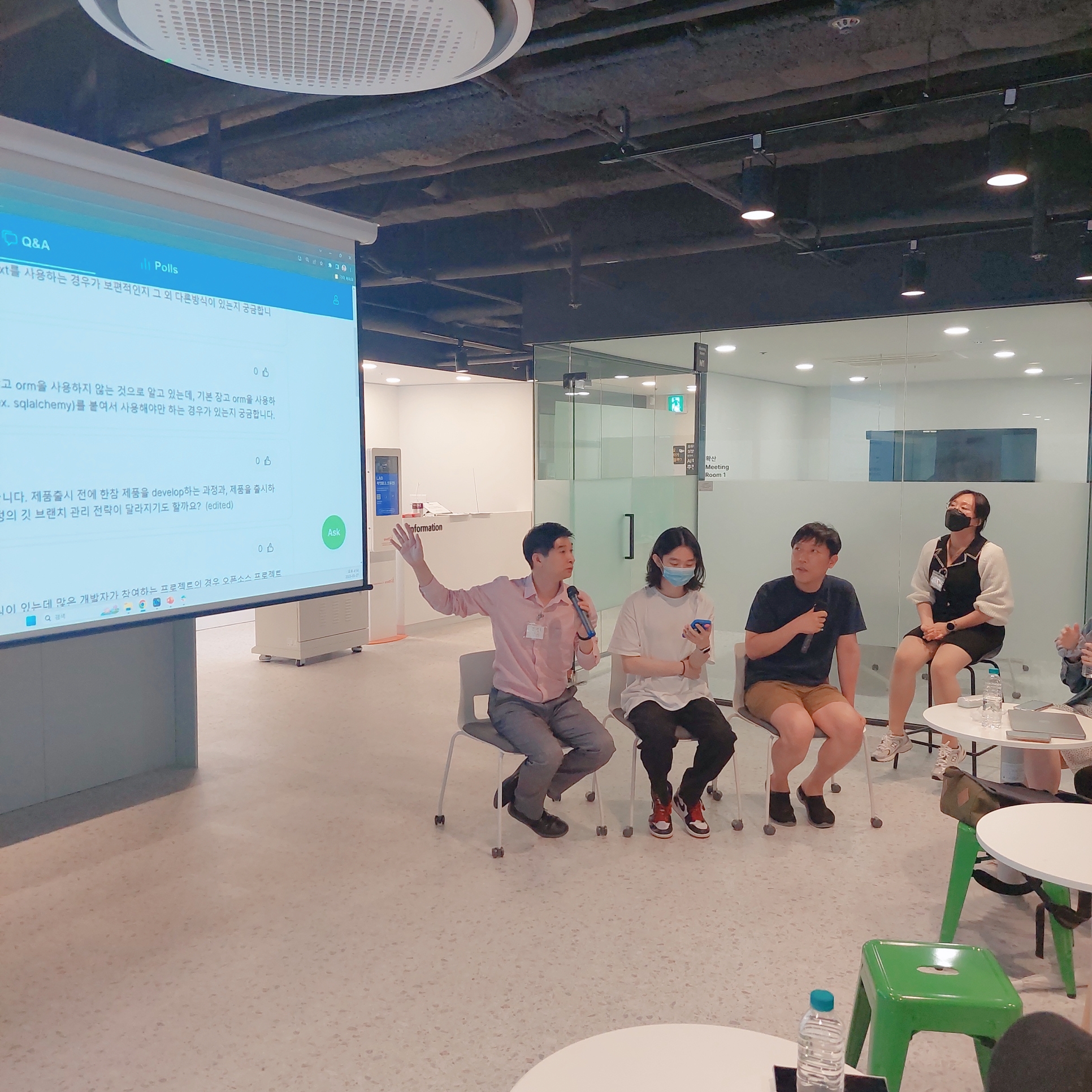 네트워킹 시간에는 참석자분들이 자유롭게 올려주신 질문을 가지고 연사자 분들과 함께 Q&A를 하면서 패널톡의 시간으로 구성하였습니다. 행사중에 언제라도 질문을 자유롭게 등록 할 수 있도록 웹을 통해 질문을 받았으며 QR 코드를 사전에 공유하는 등 행사에 대한 많은 노하우를 엿볼 수 있었습니다.