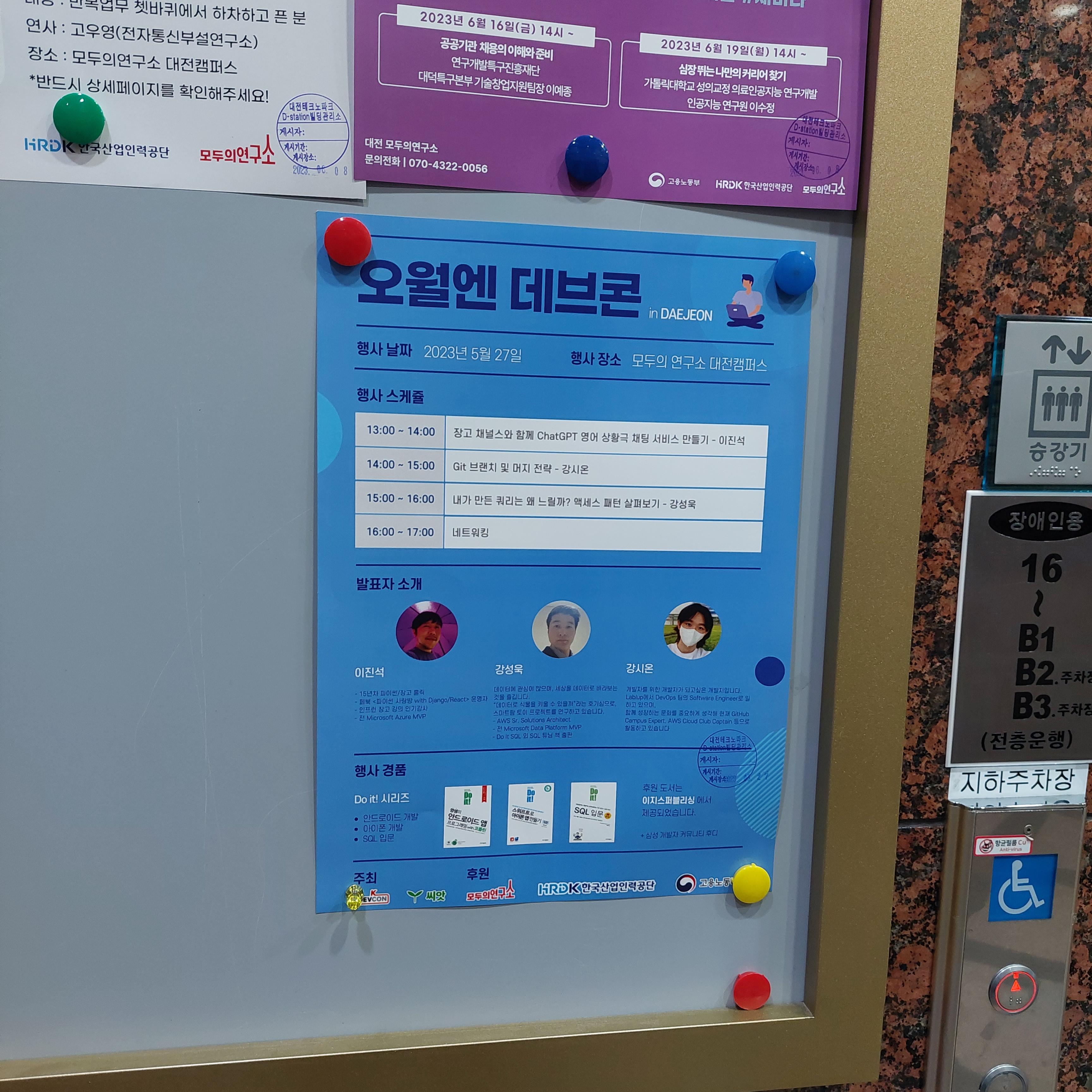 오월엔 데브콘 행사가 5/27일 모두의연구소 대전 캠퍼스에서 진행되었습니다. 이번 행사에도 유명 연사분들과 함께 하여 매우 영광이었습니다. 이번 행사에는 연휴가 포함되어 있는 주말이어서 모객모집에 대한 운영진들의 마음 고생도 많았다는데, 다행이(?) 연휴기간의 비 소식과 함께 빠르게 행사 티켓이 소진되면서 운영진 분들의 맘고생을 한시름 놓았다는 후문이 있습니다.