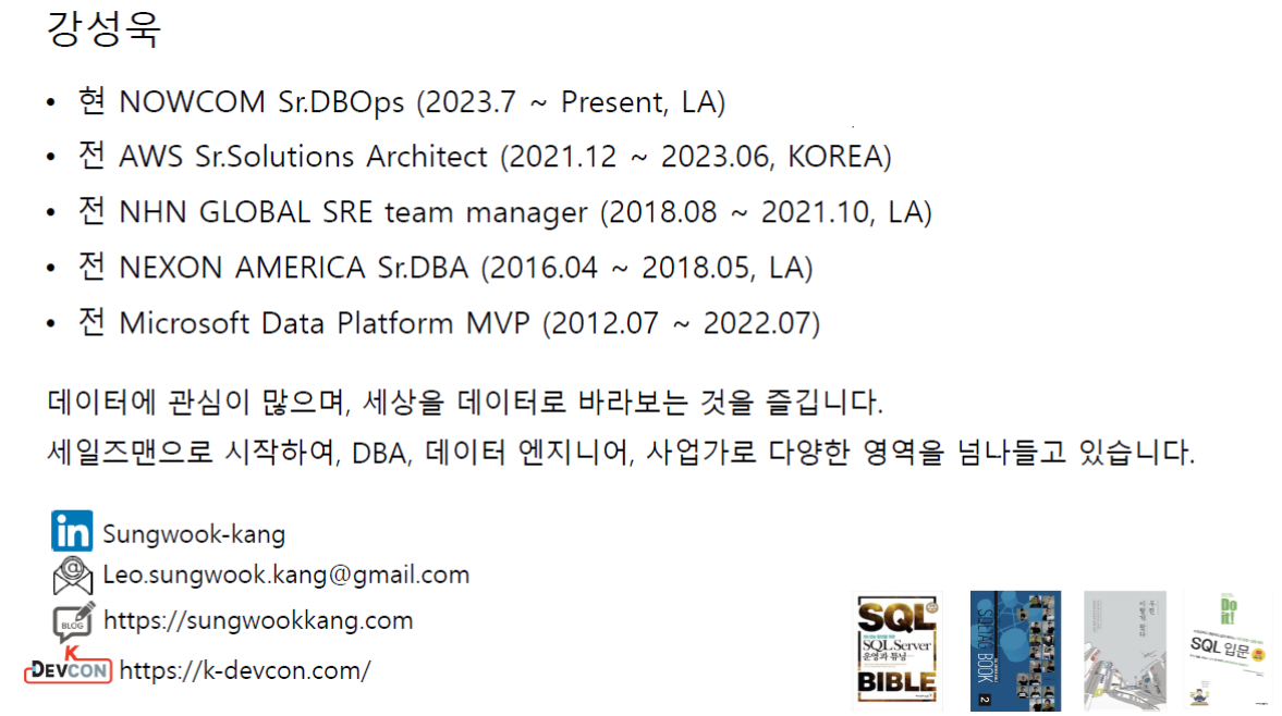 세번째 세션은 NOWCOM에서 시니어 DBOps로 재직중이며, K-Devcon의 FOUNDER이자 멘토이신 강성욱님이 진행해주셨습니다.😊