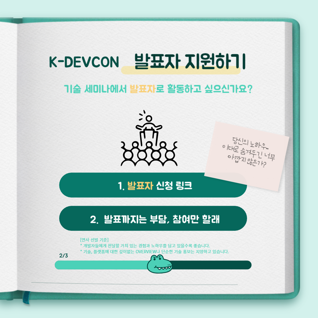K-DEVCON에서는 정기적으로 기술 세미나를 진행 합니다. 최고의 기술과 경험을 공유하며 개발자들이 함께 성장하는 자리, 컨퍼런스를 빛내주실 발표자를 모집합니다.