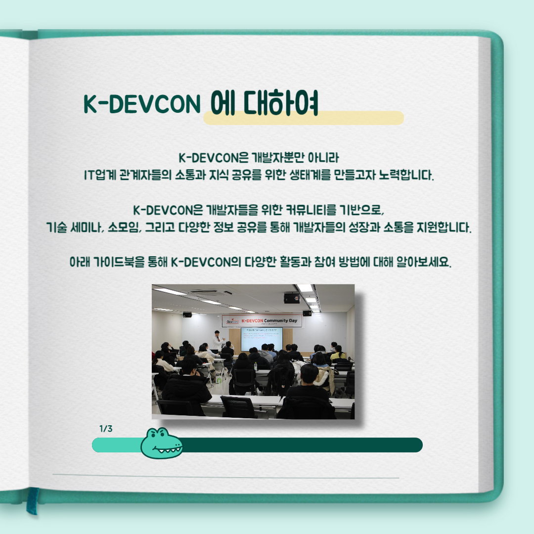 개발자들을 위한 커뮤니티를 기반으로, 기술 세미나, 소모임, 그리고 다양한 정보 공유를 통해 개발자들의 성장과 소통을 지원합니다. 아래 가이드북을 통해 K-DEVCON의 다양한 활동과 참여 방법에 대해 알아보세요.