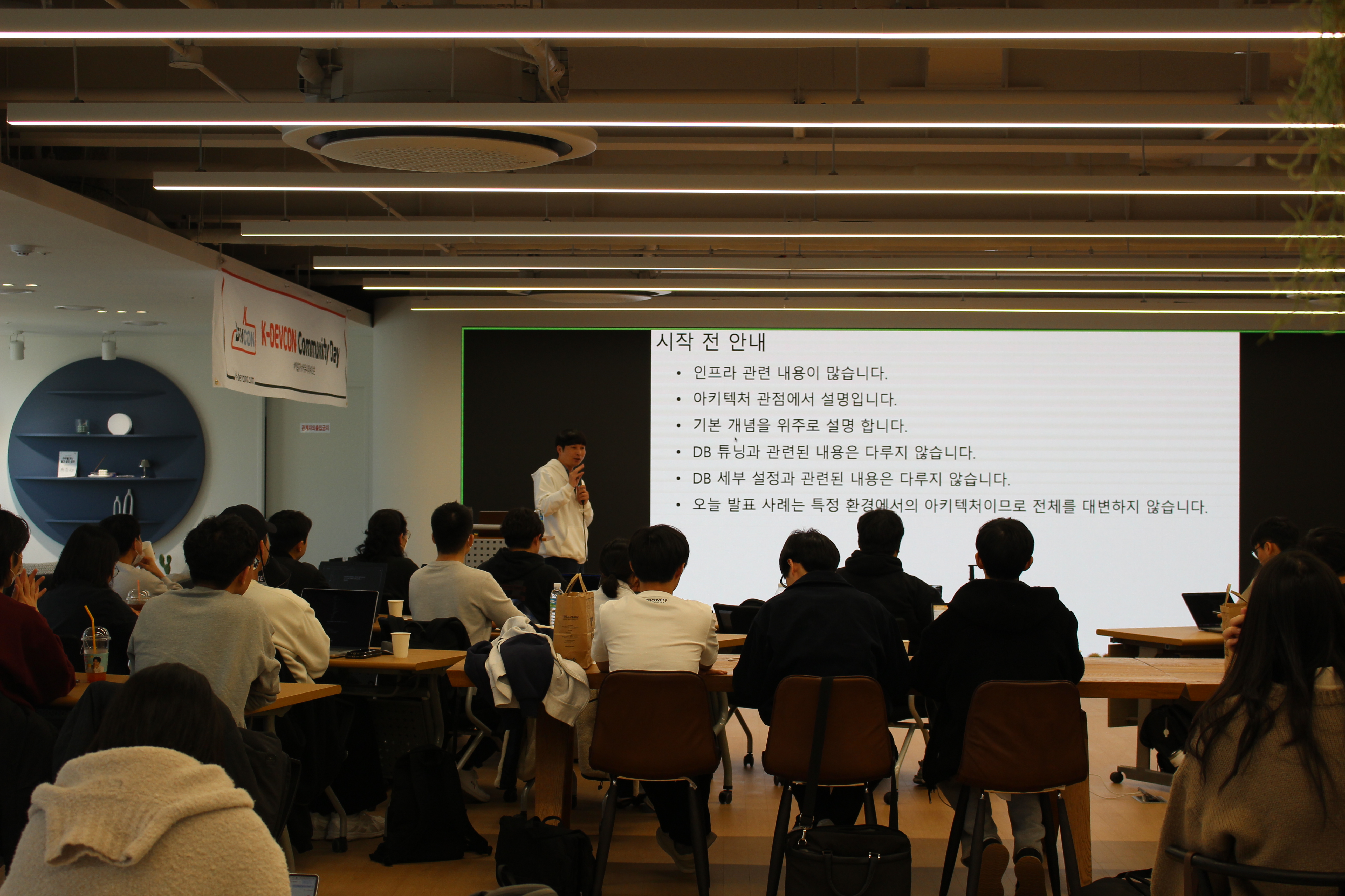 두번째 세션은 NOWCOM에서 시니어 DBOps로 재직중이며, K-Devcon의 FOUNDER이신 강성욱님이 진행해주셨습니다. 성욱님은 NEXON 및 NHN, AWS 등을 거쳐 시니어 DBA, 데이터 엔지니어, DBOps로 다양한 영역을 넘나들고 계시며 현재는 SW Maestro 멘토도 겸하고 계십니다.😊