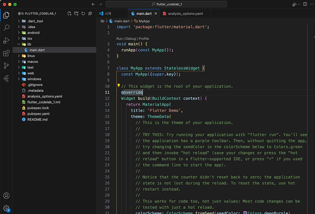 간단히 요약하면, Dart코드의 정적 분석 설정을 구성하는데 사용되고, 코드 실행 전에 문제를 찾고 잠재적인 버그 예방에 도움을 주는 파일이라고 합니다. CodeLab에서 정의된 내용대로 수정을 하겠습니다.