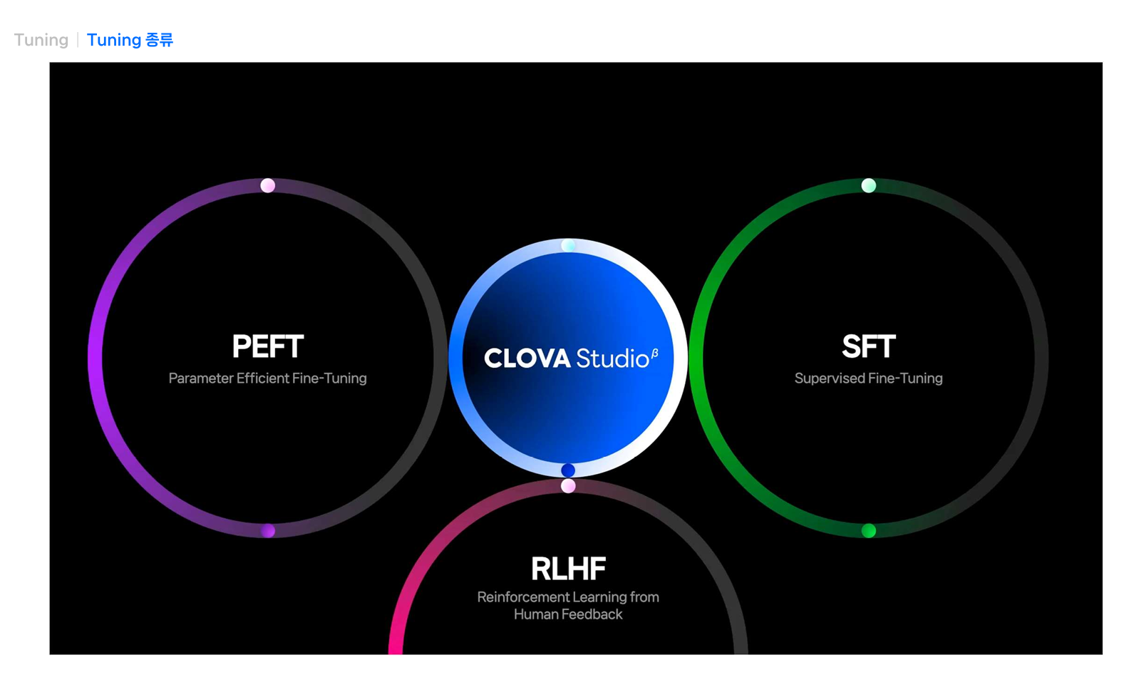 Tuning : 언어모델에게 원하는 출력 스타일을 연습 시키는 것을 튜닝이라 하며 네이버 CLOVA 스튜디오를 통해 다양한 튜닝 종류를 엿볼 수 있었습니다. 기본 모델의 능력치를 유지하면서, 모델의 답변(문제, 표현 등 스타일)을 일부 조정할 수 있는 학습기법인 PEFT(Parameter-Efficient Fine Tuning), 모델을 원하는대로 자유롭게 조정할 수 있는 학습 기법인 SFT(Supervised Fine Tuning), 모델에 지식을 주입하여 성능을 향상시키는 기법인 FP(Further Pretraining), 모델이 답변해야하는 내용, 답변하지 말아야할 내용에 대한 정책을 반영하는 학습 기법인 RLHF(Reinforcement Learning from Human Feedback) 등이 있습니다.