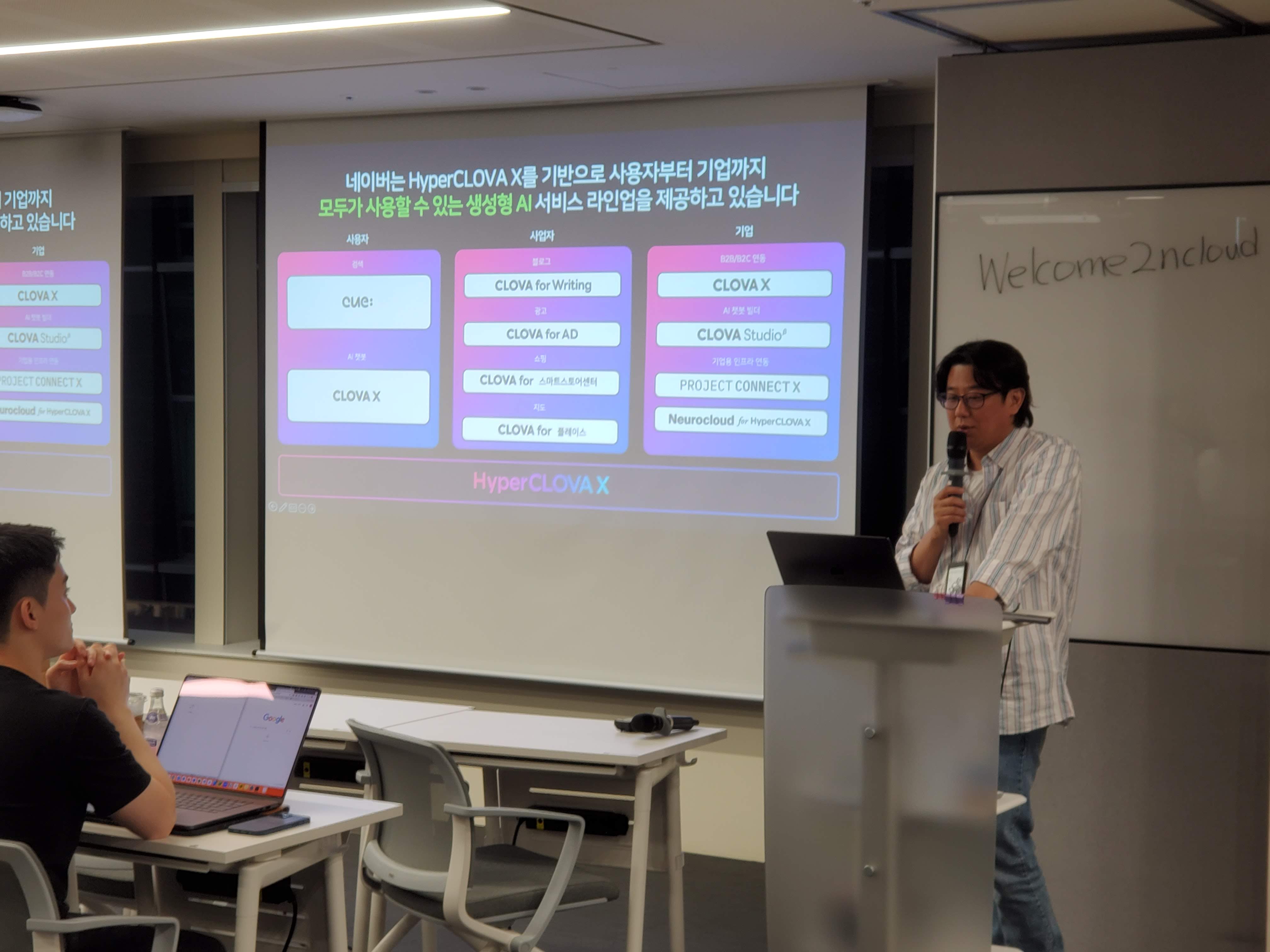 1부 순서는 네이버 생성형 AI, HyperCLOVA X 에 대해서 알아보기라는 주제로 정주환님께서 연사로 나서주셨습니다. 인터넷 산업 변화의 중심에는 국내에서는 네이버가 독보적인 위치에 있는 만큼, AI대응에 발빠른 전략으로 다양한 생성형 AI 서비스 라인업을 제공하고 있습니다. 일반 사용자(유저), 사업자(네이버 블로그, 광고, 쇼핑 등 이용), 기업(B2B/B2C연동 및 기업용 인프라 지원)에 맞춤형으로 서비스를 사용할 수 있다는 장점이 눈에 띄였습니다.