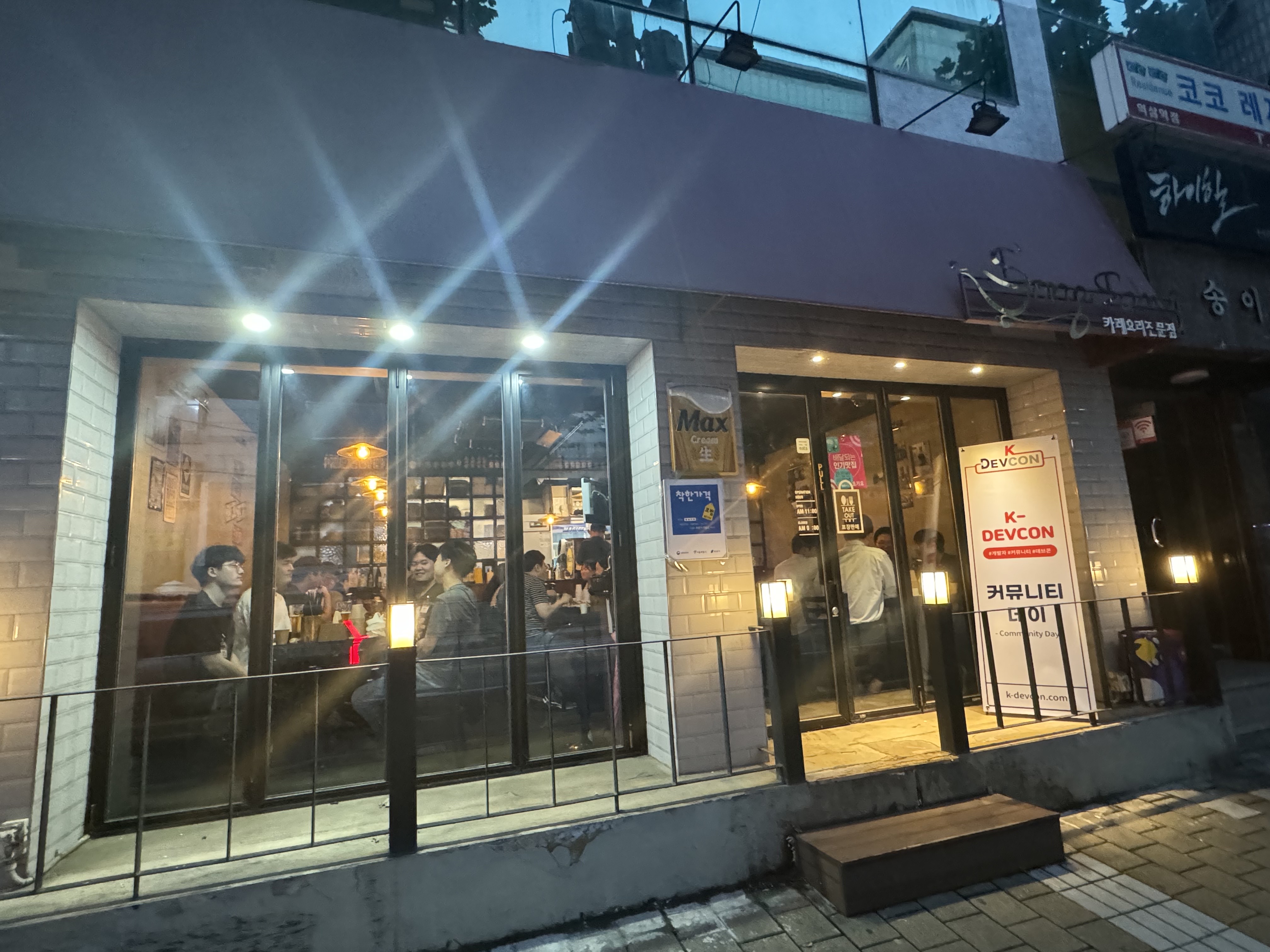 안녕하세요 K-DEVCON(k-devcon.com) 입니다.6월 서울 챕터에서 밋업을 개최한 후 긴~장마와 무더위가 찾아왔습니다. 저희 운영진은 데브콘 행사를 재정비하고자 한 번 쉬어가자고 마음을 먹었습니다. 만!!! 7월에도 휴가는 커녕 사무실에서 바캉스(?)를 하는 데브콘 회원들을 보고 간단히 퇴근 후 강남에서 치맥을 하면 어떨까 의견이 나와 급하게 기획했습니다. 장소 섭외부터 포스터 제작, 사전 리허설 및 당일 셋팅을 위한 명함 제작까지 우리 운영진은 즐겁게 이 행사를 준비했습니다. 기획할 시간이 많지는 않아 살짝 걱정을 했지만 선착순 마감이었음에도 티켓이 빠르게 소진되었습니다. 정말 놀라웠습니다~!! * 포스터제작 : 데브콘 운영진 홍유미 님 행사는 강남 역삼동 근처 송송카레에서 저녁 7시 반..