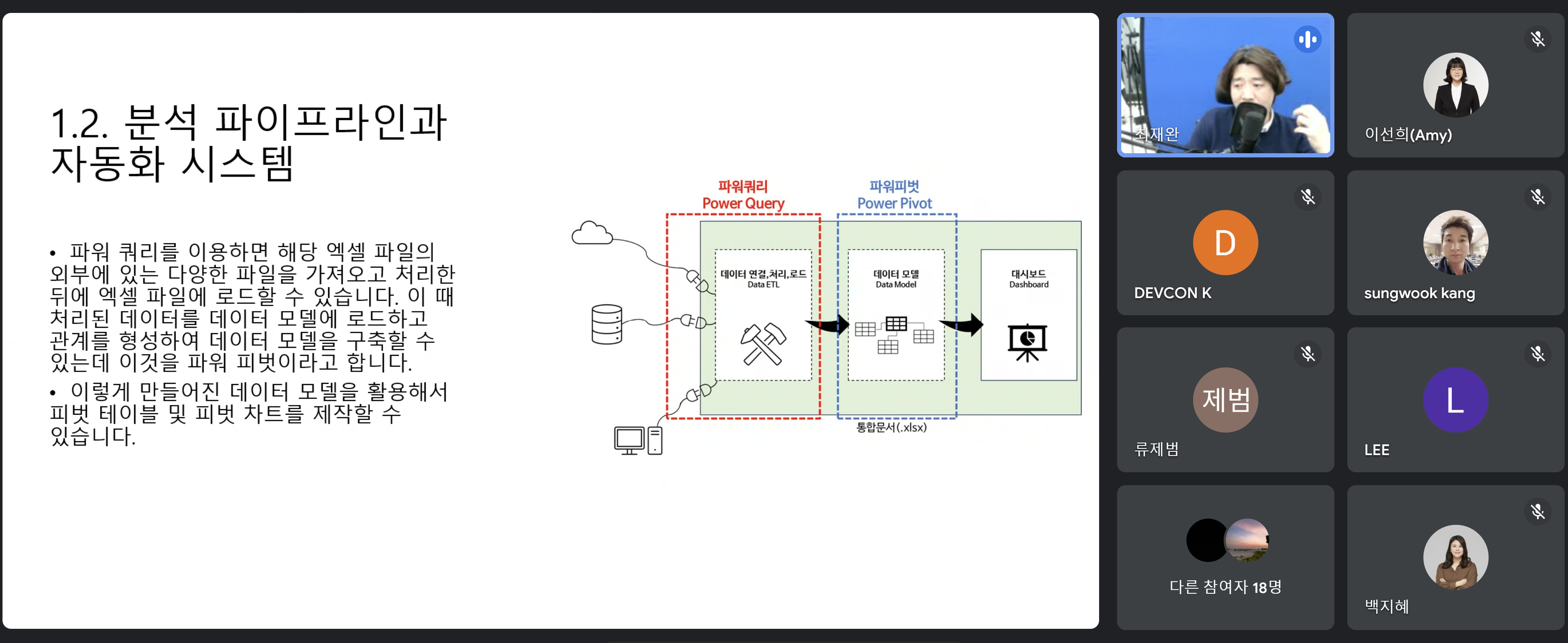 특강의 핵심은 엑셀의 파워 쿼리(Power Query)와 파워 피벗(Power Pivot)을 활용하여 데이터 파이프라인을 구축하고 자동 분석 시스템을 만드는 방법이었습니다. 기존의 엑셀 함수와 피벗 테이블을 넘어서, 데이터를 연결하고 처리하는 프로세스를 자동화하는 것이 핵심이었죠.