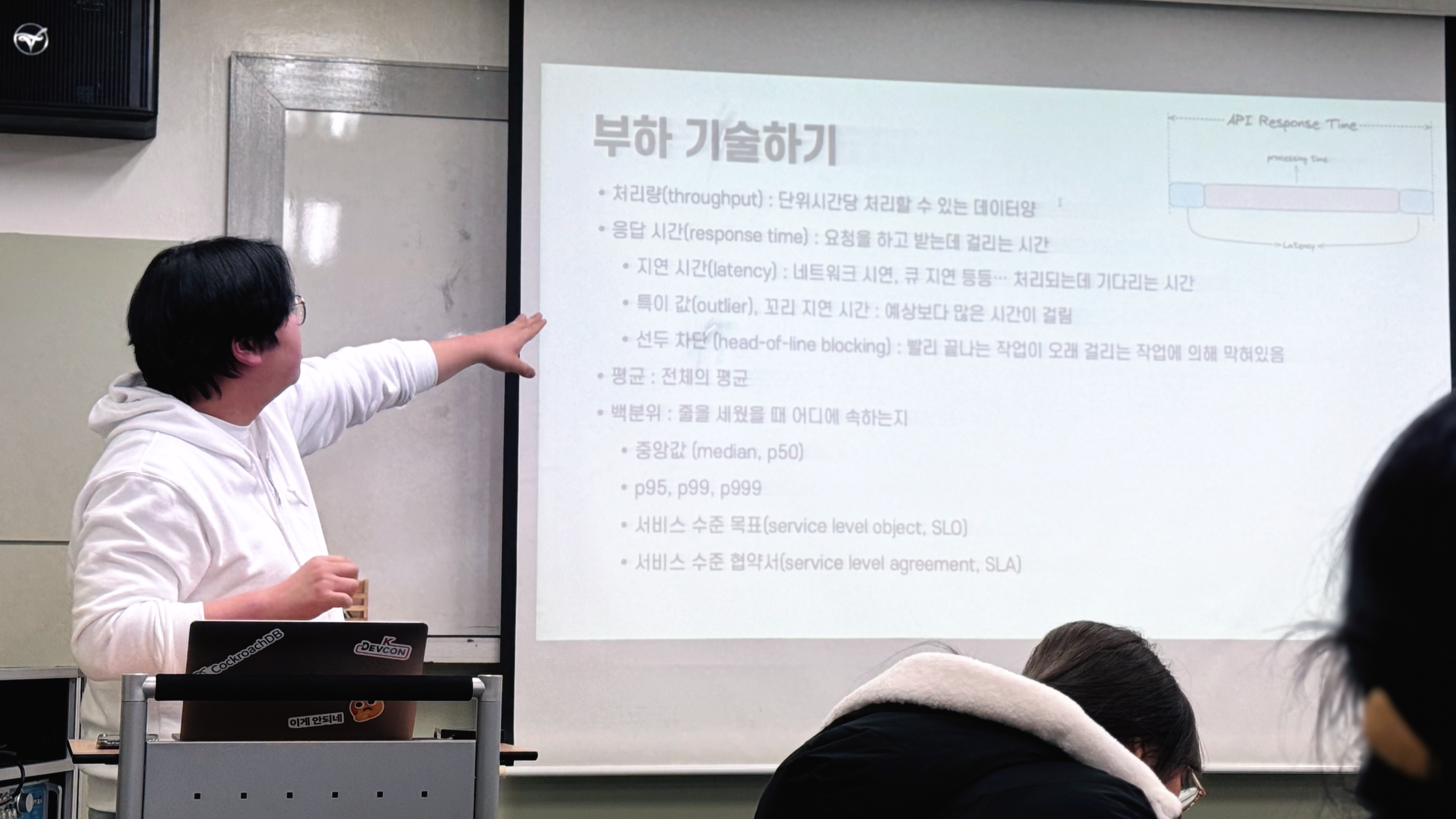 확장성은 증가한 부하에 대처하는 시스템 능력을 설명합니다. 부하를 다루기 위해서는 무엇보다 시스템의 현재 부화를 간결하게 기술할 수 있어야 합니다. 그래야 부하 성장 질문을 논의할 수 있습니다. 기초 개념부터 명확히 하기 위해서 부하를 기술할 때 사용되는 용어들을 먼저 정리하였습니다. 응답 시간과 지연 시간도 쉽게 혼용되는 용어인데, response time, latency 원어로 함께 살펴보니 다름이 한눈에 파악이 됩니다.