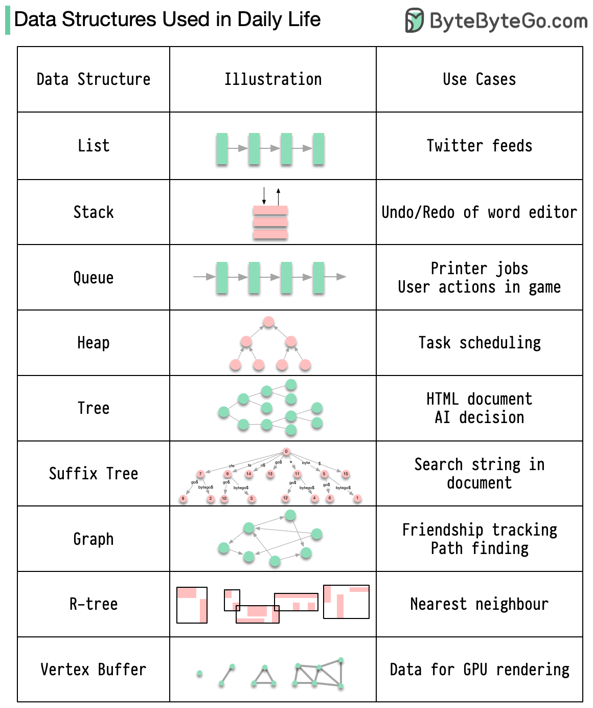 대표적으로 사용되는 자료구조와 그 예시는 다음과 같습니다.