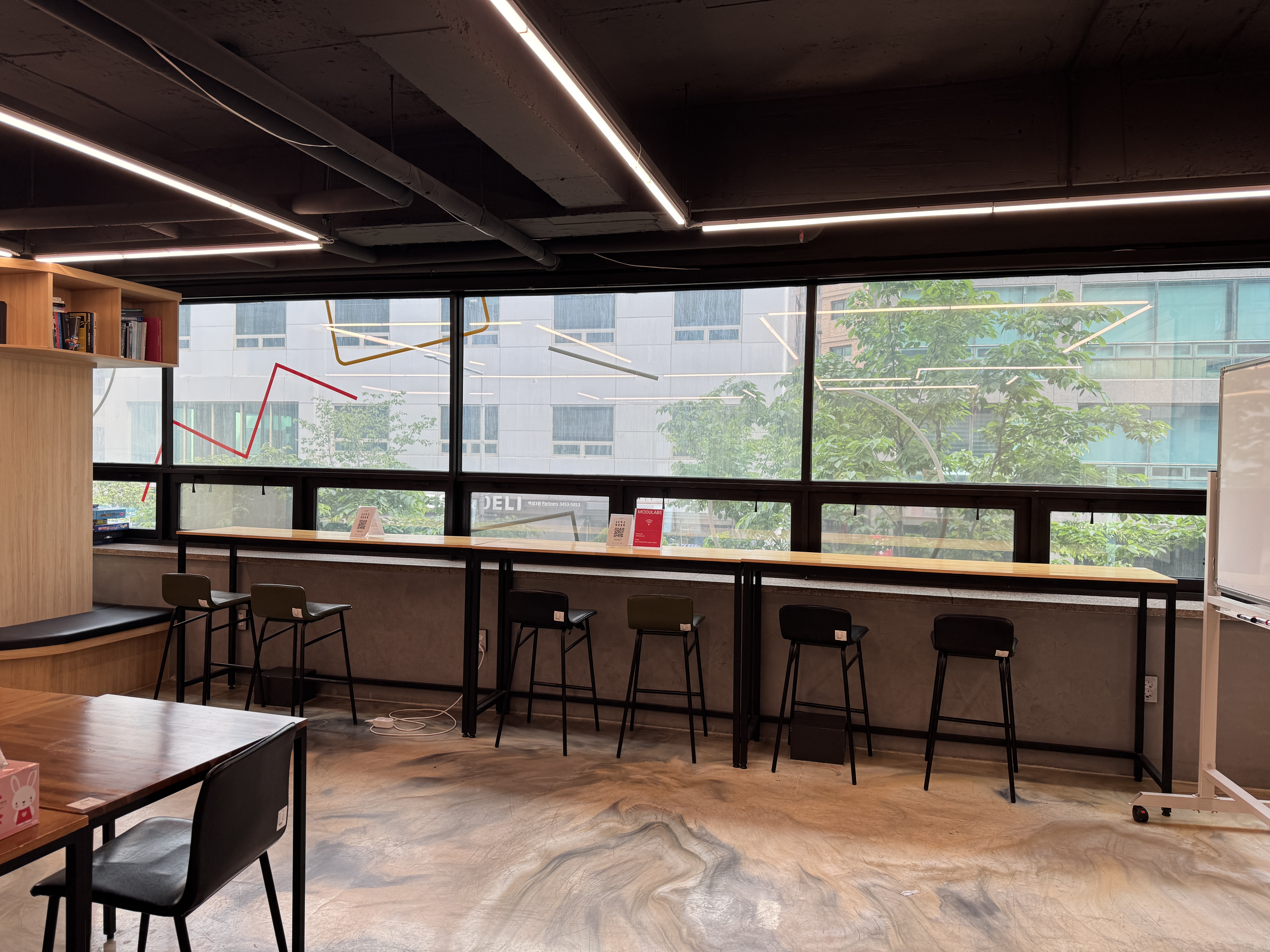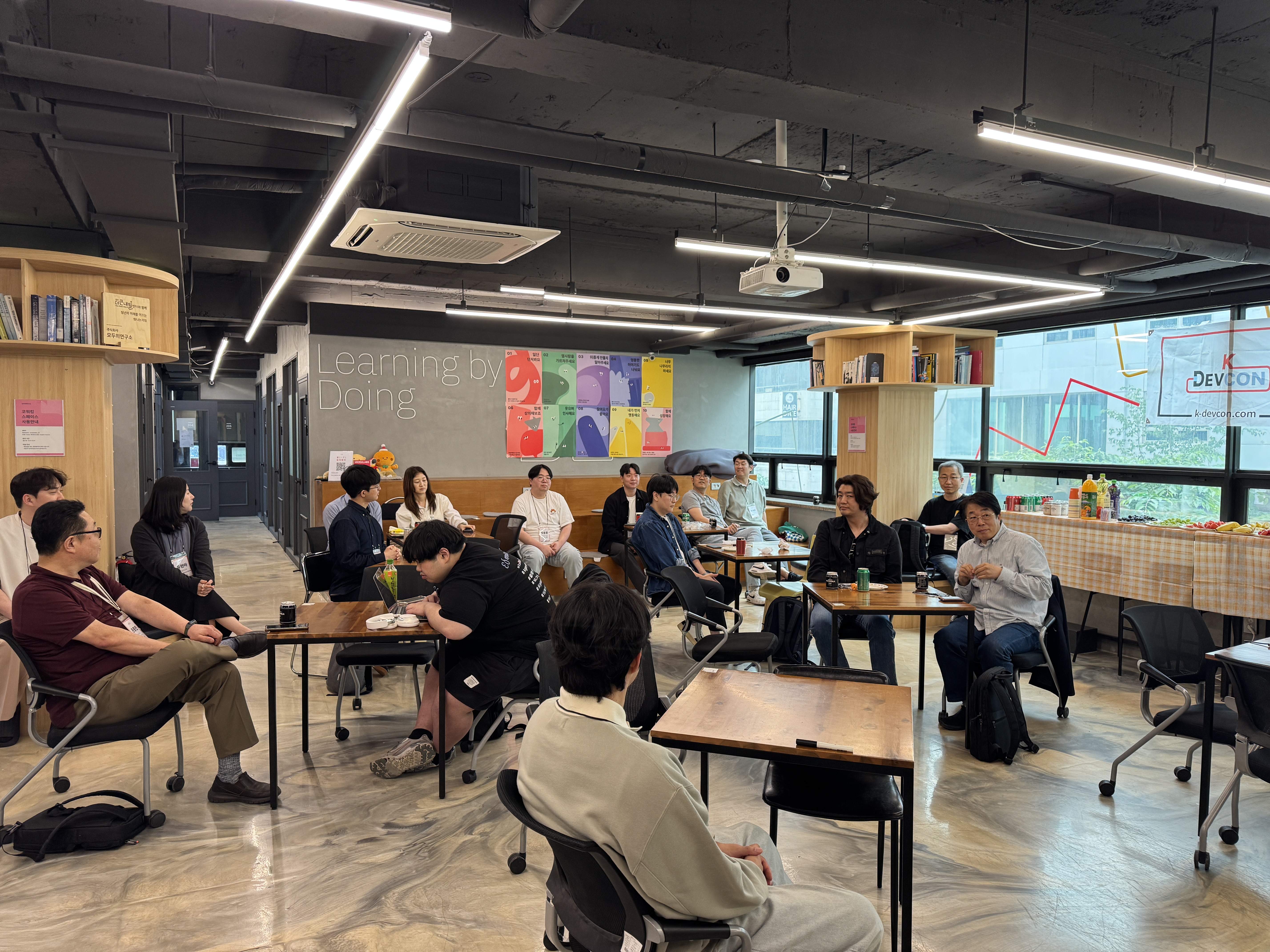 이번 밋업 장소는 모두의 연구소 역삼점에서 자유롭게 네트워킹을 하는 자리였습니다. '모두의 연구소'는 AI와 SW교육을 제공하며 자유롭고 안전한 연구를 지향하는 커뮤니티 장소도 제공하는 플랫폼으로, 개발자, 디자이너, 기획자, 교육자 등 다양한 사람들이 모여 배우고, 실험하고, 연결되는 소중한 장소였습니다. 그 중 역삼점은 오픈된 분위기와 아늑한 공간 덕분에 작은 밋업이나 스터디, 커뮤니티 모임에 딱 좋은 장소였고, 이번 데브콘 밋업처럼 ‘함께 있는 것만으로도 의미 있는 시간’을 만들기에 참 잘 어울리는 곳이었답니다. 🌿